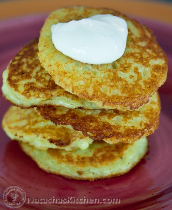 Ukrainian Pancakes Deruny, are usually served for lunch or breakfast and are very popular in Ukraine! You may enjoy them with some meat or your favorite salad. My husband and kids really love them with just a dollop of sour cream.